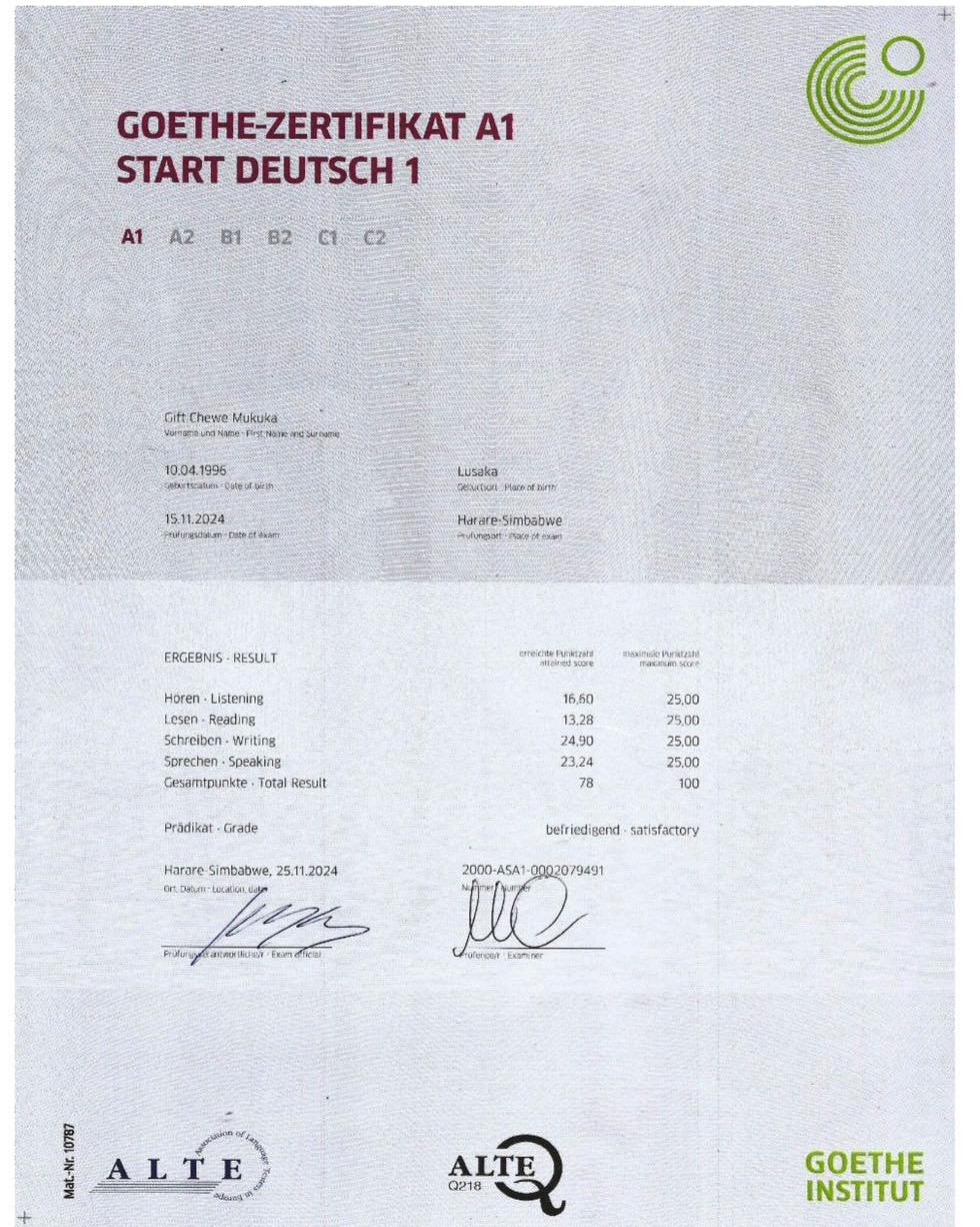 Jonathan joined us for our very first A1 class in August 2024 as a first step towards achieving his dream. He had a very good grip on the German grammar in the early stages of the class and it was quite apparent that he was going to do well. He produced excellent results in his examination and was in his B1 class when he left for Germany.